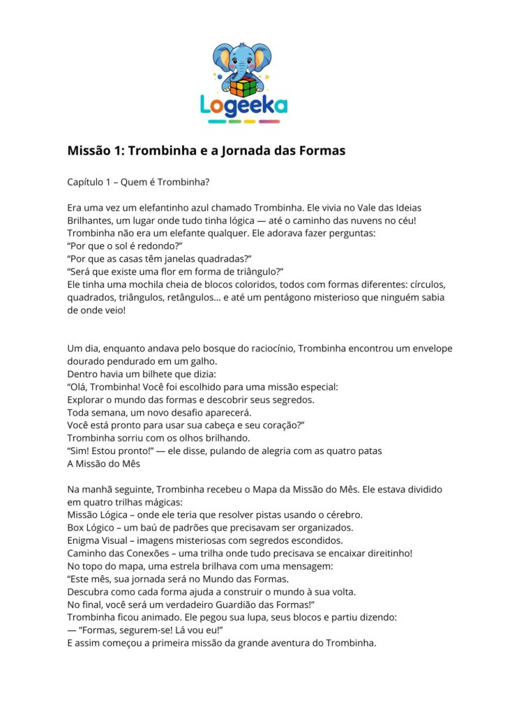 Este módulo é composto por quatro atividades semanais, que devem ser realizadas na ordem proposta. Comece pelo botão “Storytelling” para conhecer a história do mês. Em seguida, desbloqueie uma nova atividade por semana. Cada desafio estimula uma habilidade lógica diferente. Reserve um momento calmo e sem pressa, e acompanhe a criança durante as atividades para potencializar a aprendizagem com afeto e curiosidade.